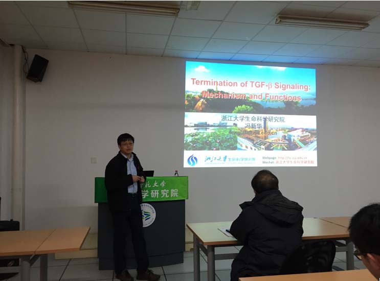 2016年12月22日上午,浙江大学校长特别助理、生命科学研究院院长冯新华教授应邀来我院为广大教师做了题为“Termination of TGF-β Signaling: Mechanism and Functions”学术报告,邱猛生院长主持报告会。报告中,冯教授首先阐述了TGF-β信号通路在正常细胞中的作用,即PPM1A介导的去磷酸化和RanBP3/RanBP3L调控的出核转运协同作用,关闭了TGF-β信号通路;其次,冯教授阐述了TGF-β信号通路与癌症的关系,即在多种癌细胞中,多种类型的基因突变造成TGF-β信号通路的活性下降。报告内容非常精彩,与会的老师表现出浓厚兴趣,各自提出了自己关心的问题,现场气氛热烈。