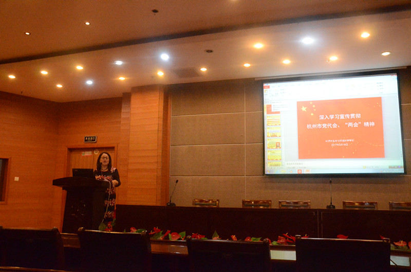 首先学院党委书记周春儿对杭州市第十二次党代会、市第十三届人民代表大会 、市第十一届政治协商会议的整体概况进行了介绍。接着,周春儿书记就市党代会报告以及2017年杭州市政府工作报告进行了具体解读。她对市党代会的主题、党代会报告的主要内容、关键词(G20峰会、GDP万亿元等)、今后五年的奋斗目标等进行了理论联系实际的讲解;重点解读了党代会报告提出的六个“坚定不移”(坚定不移实施创新驱动发展战略,巩固创新活力之城优势;坚定不移繁荣发展社会主义先进文化,展示历史文化名城魅力;坚定不移拓展对外开放新优势,建设国际重要商贸中心;坚定不移推进美丽中国样本建设,打造生态文明之都;坚定不移推进共治共管共建共享,深化东方品质之城建设;坚定不移推进全面从严治党,为加快建设世界名城提供根本保证。)接着,周书记简明概括了2017年杭州市政府工作报告的主要内容。并围绕“创新创业”、“文化引领”、“城乡协调发展”、“开放合作”、“生态良好”、“宜居宜业”这几个关键词进行工作部署。