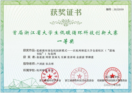 近日,首届大学生低碳循环科技创新大赛在杭州举行。我院本科生翁盈盈、周倩、张雨凡、吴颖、张泽琦、金露露和覃柳蕙等7位同学组成的“绿色空间队”从全国20余个省(直辖市、自治区)的140余所高校904个项目中突出重围,获特等奖。项目名称为“低碳循环绿色校园新模式——以杭州师范大学仓前校区(“湿地书院”)为范例”,指导老师为我院卢剑波教授、宋垚彬教授。
